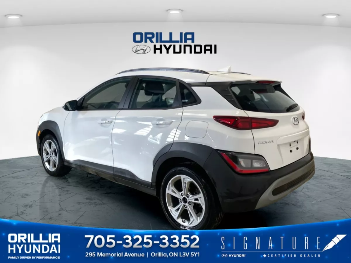 Set your sights on the 2023 Hyundai Kona 2.0L Preferred AWD, a pristine white SUV that promises a commanding performance with its AWD drivetrain and automatic transmission. This model effortlessly combines style and capability, providing a smooth and assured handling experience.